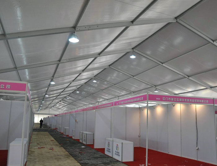 展覽帳篷采用高強(qiáng)度鋁合金框架,雙面PVC涂層篷布,蓬內(nèi)無(wú)任-何支柱。蓬內(nèi)使用容量寬廣,大型展棚有10米到50米多種跨度,單元長(zhǎng)度有3米、5米兩種,并且有多種高度可供客戶選擇。