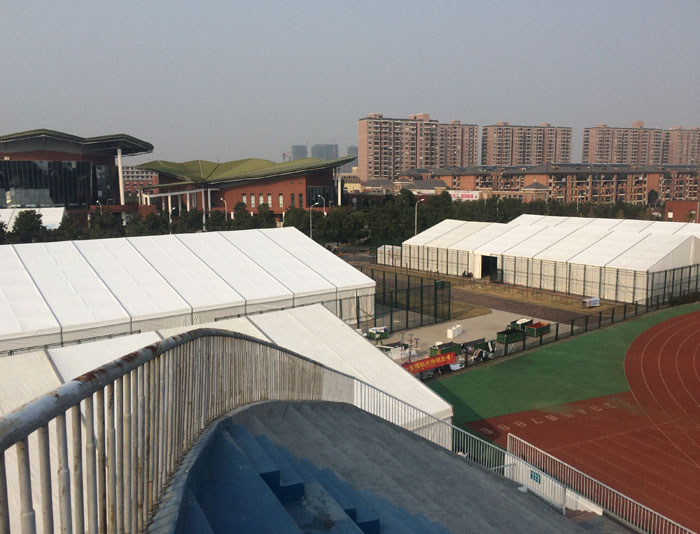 大型展篷采用高強(qiáng)度鋁合金框架,雙面PVC涂層篷布,蓬內(nèi)無(wú)任-何支柱。蓬內(nèi)使用容量寬廣,大型展篷有10米到50米多種跨度,單元長(zhǎng)度有3米、5米兩種,并且有多種高度可供客戶選擇。