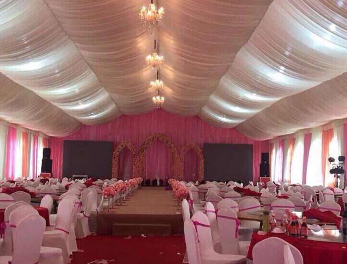 婚宴篷房采用高強度鋁合金框架,堅固耐用,雙面PVC涂層刀刮布,并有多種顏色可選用,抗風防雨,一至兩天就可搭建完一個非常大的婚宴篷房,再經(jīng)過匠人們的精心裝飾,很快就會成為一座豪華的非常溫馨的婚禮殿-堂。